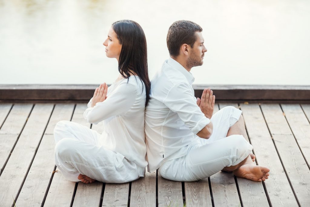 In peace with universe. Side view of beautiful young couple in white clothing meditating outdoors together while sitting back to back in lotus position